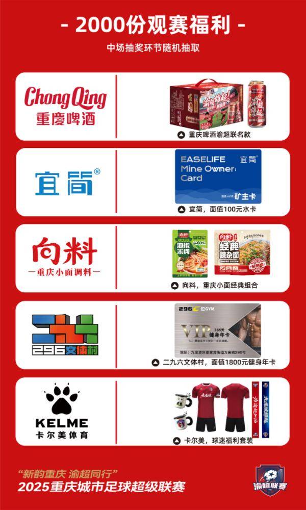 本场比赛门票将于12月1日(周一)15:00正式开售。届时,球迷朋友们可以通过登录大麦网网页端或使用大麦APP进行购票,共同见证这场期待已久的城市足球对决。值得一提的是,九龙坡队主场已为大家准备好共计2000份中场抽奖福利!包含重庆啤酒渝超联名款、宜简水卡、向料重庆小面组合、296文体村健身年卡、卡尔美套装等……热情邀请球迷们相聚奥体,用掌声和欢呼,唤醒尘封已久的热血记忆,续写属于重庆足球的燃情篇章!