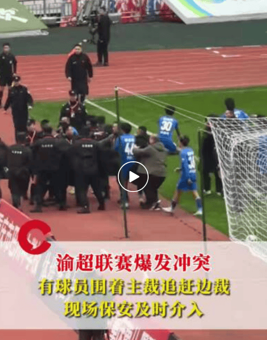 多名网友的现场视频显示,比赛双方拼抢激烈,大渡口队在最后时间段的进球被吹掉后,身着蓝色球衣的大渡口队球员因不满判罚,纷纷上前围着主裁,还有替补席的成员冲进场内。视频显示,有身着蓝色球衣的球员选择追赶边裁,边裁则是“拔腿就跑”,现场混乱。随后现场安保及时介入,控制了场面。现场主持人则通过广播呼吁:“请现场的球员保持冷静。”