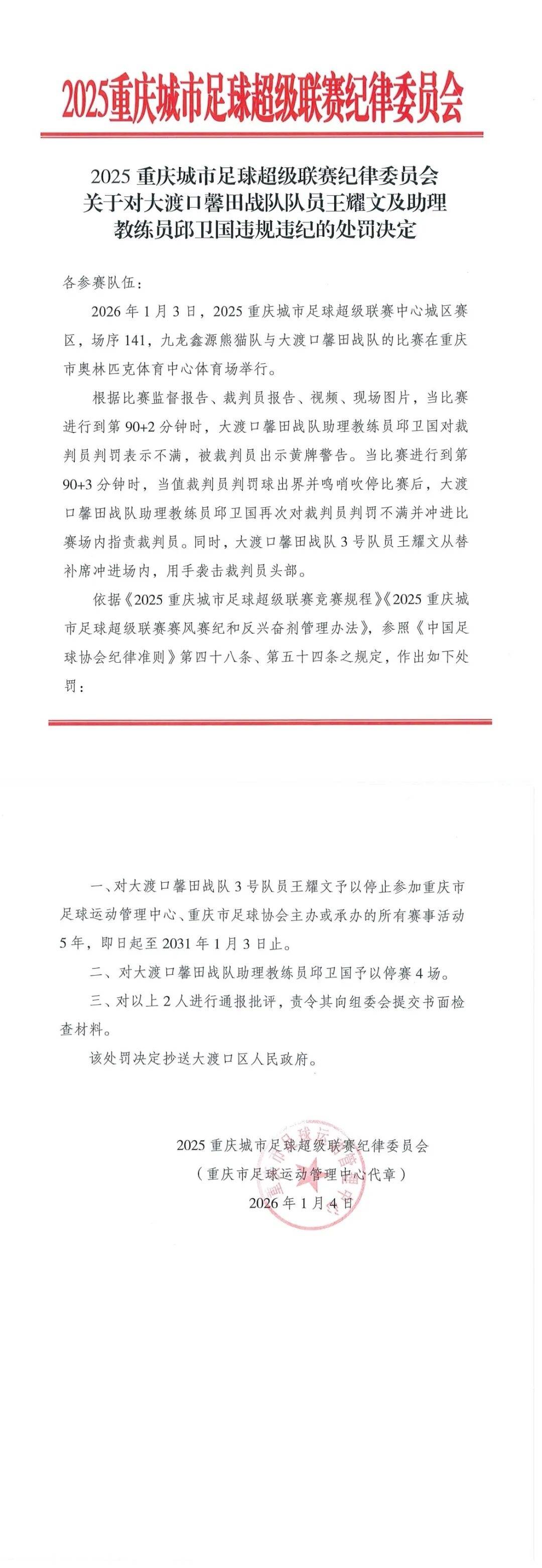 1月3日,2025重庆城市足球超级联赛中心城区赛区,场序141,九龙鑫源熊猫队与大渡口馨田战队的比赛在重庆市奥林匹克体育中心体育场举行。根据比赛监督报告、裁判员报告、视频、现场图片,当比赛进行到第90+2分钟时,大渡口馨田战队助理教练员邱卫国对裁判员判罚表示不满,被裁判员出示黄牌警告。当比赛进行到第90+3分钟时,当值裁判员判罚球出界并鸣哨吹停比赛后,大渡口馨田战队助理教练员邱卫国再次对裁判员判罚不满并冲进比赛场内指责裁判员。同时,大渡口馨田战队3号队员王耀文从替补席冲进场内,用手袭击裁判员头部。