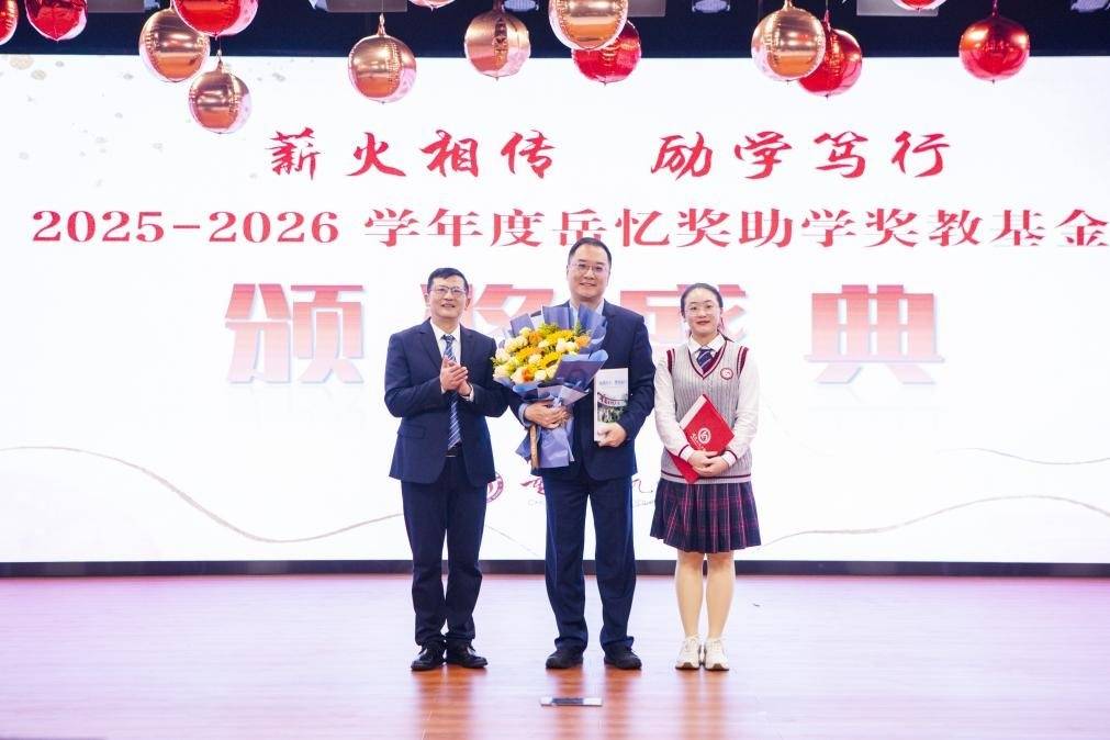 重庆二十九中党委书记杨培宣读了2025-2026学年度岳忆奖助学奖教基金的表彰决定,代表学校向廖望赠送纪念礼品。