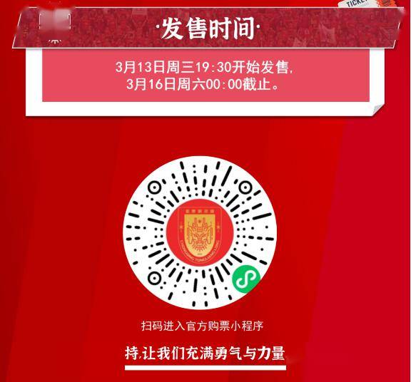 本场比赛球票将于3月13日(星期三)19:30准时开售,售票时间截止到3月16日0:00。