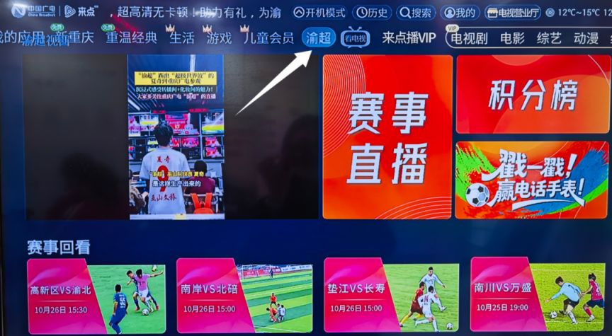 1. 打开电视,进入中国广电机顶盒首页,在页面找到“渝超”专题入口,点击就能进入直播专属页面。